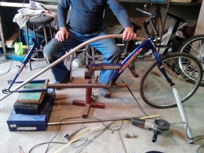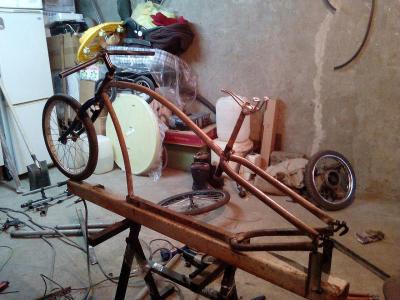 Пока жду железа и токаря, решил Жене на выходных собрать раму из того что было в гараже  :-) Только передняя вилка будет другой, длиннее, вот думаю как лучше траверсы изготовить?! :bw: