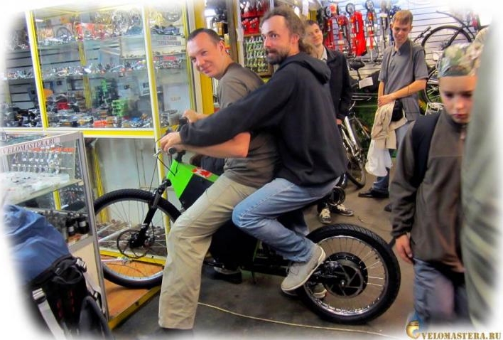 Нам такой вид посадки не подходит.  На раме, что в Сокольниках есть,  сидеть удобно.  Но вот педали крутить так же неудобно как на мотоцикле.  Посмотрите посадку мотоциклистов, представьте что у мотоцикла педали есть.  Сразу поймете о чем я.  :-)   Увы, при увеличении скорости, мощности мотора,  веса и прочности рамы велик  мигрирует в сторону мотоцикла - во всем, в посадке в том числе, и от этого никуда не деться.   Велики для скоростного спуска с гор так не выглядят, так как они достаточно ажурные. Нам же нужен бокс для АКБ.  В профиль - типичный легкий мотоцикл, ну точнее мопед.  Особенно с двухкоронной вилкой.