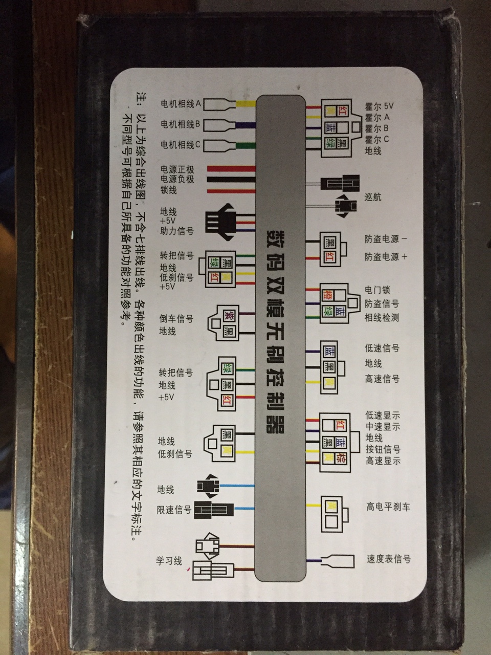 Давно меня не было на форуме! Была зима, эл-вел зимовал. Сейчас все расчехляю. Друг притащил в хлам убитый скутер, попросил оживить. Все наладил, прилепил простой контроллер на 500 Ватт, все крутится и вертится, но он на 48 вольт, а скутер на 60. Что бы ничего не переделывать нашел у себя в хламе китайский контроллер 60 вольт 600 ватт. Но вот беда, ноги вроде бы все понятны, но не едет. Как я понял он самообучающийся, некоторые разъемы не могу въехать что куда. Силовые цепи все соединяю, тормоз вешаю, дроссель даю, не едет колесо. Может кто сможет помочь расписать разъемы? Уж больно не хочется его разбирать. Картинка отличная на коробке есть. Но на китайском языке.