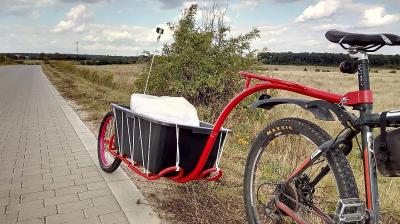Уже имею год эксплуатации прицепа с креплением в одной точке на багажнике и двумя колёсами прицепа типа  тачки. Приехал к магазину или  складу, отцепил прицеп и  грузишь на любой площадке до 100кг. Сама тачка легко управляется вручную.  100кг тянуть велосипедом без мотора уже проблематично.
