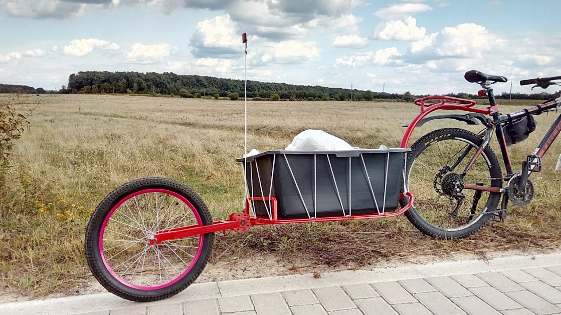 Ну впринципе в виде тачки садовой и надо с двумя колесами, только крепление нормальное, можно к оси мотора, хотя не, лишняя нагрузка, надо к раме или за седло. Я садовую тачку цеплял и цепляю за седло обычного вела, купил два сантех хомута и сварил. Правда это конструкция не очень, надо как на авто, по такому типу. А так возить надо до 100кг. Скажем пару мешков с цементом привезти, какие то железки, нагрузить вещами каками-то.