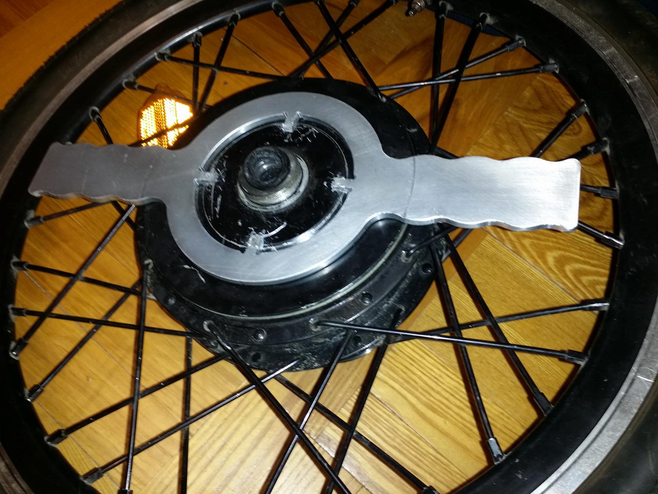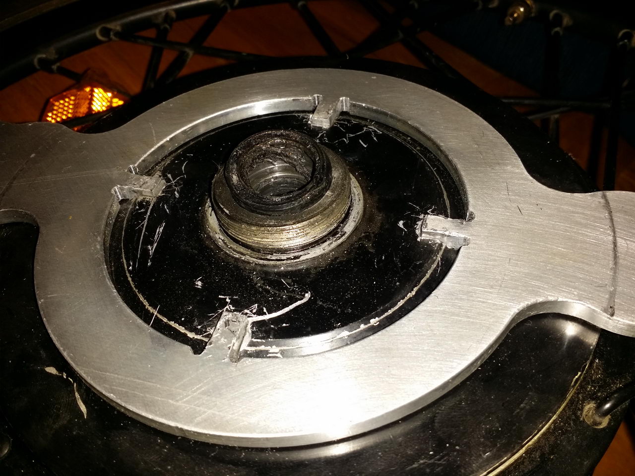 Подарили такой мотор - со сбитыми шлицами. Я в крышке нарезал резьбу на М-6 и прикрутил к ней полуметровый уголок. Сам мотор прикрутил через ненужный тормозной диск к доске с отверстием под ось. Затем долго был молотком по уголку и всё же раскрутил. К сожалению некоторые заходы резьбы от такого издевательства раскрошились, но закрутить обратно не составит труда.