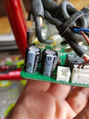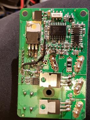 Поменял конденсаторы на 50v. Подключил батарею на 36в , лампа на контроллере горит а мотор стоит. Ставлю 24в и все работает.  Сделал фото потрохов контроллера может кто ткеет что еще сменить?