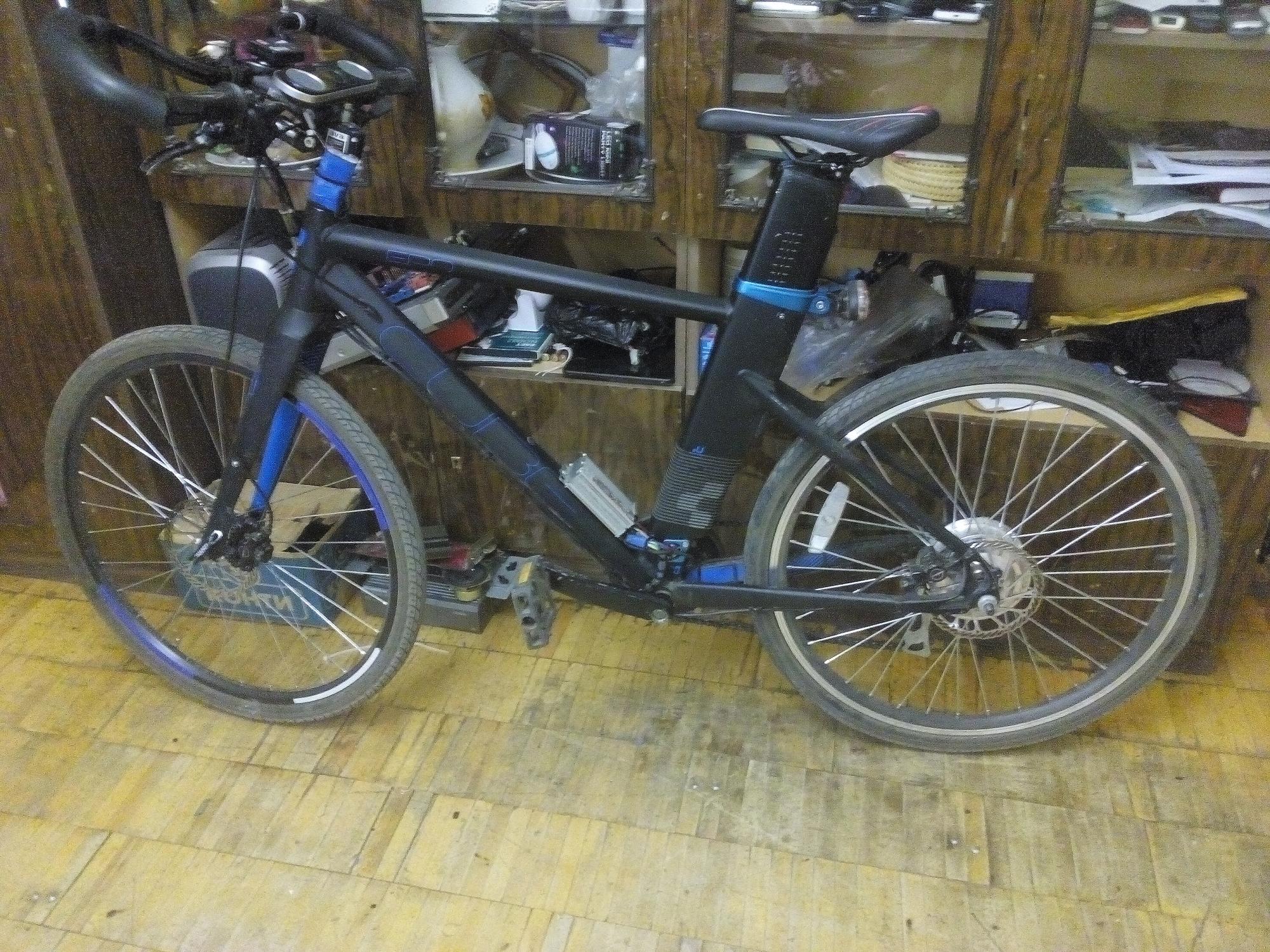 Попал мне в руки некомплектный и нерабочий куб эпо.аккумулятор дохлый,бортовой компьютер не видит ни мотор ни батарею.навески ноль,только рама,вилка и стойка седла(она же батарея) и переднее колесо.пол года думал что с ним делать.и вот решил превратить его в бюджетный лёгкий гибрид.обвес самый разношёрстный-манетки alivio 9x3,переключатели acera,каретка картридж на промах,тормоза гидравлика tectro draco,система alivio,вынос ks ava,руль бабочка,седло от шоссера.из электрики-аккумулятор бутылка 36в 12ач,контроллер электра 350ватт и мотор неизвестного производителя(редукторник 300 ватт).все провода убраны в раму а контроллер в пустую стойку седла.должен сказать получилось весьма неплохо.для среднескоростной езды(30км/ч) самое то.мотором пользуюсь синхронно с педалями.и ноги не устают и зарядки хватает на 35-40 км.по прямой ровной дороге мотор легко держит скорость без помощи педалями.при необходимости легко конвертируется в полушоссер.снимаются колёса 26(и мотор соответственно),снимается батарея с крепления и ставятся колёса 28 с узкими шинами.весит очень мало даже в модификации электро.хотел бы ещё заиметь самый лёгкий моторчик в переднем 28 ободе.может кто из местных поможет?