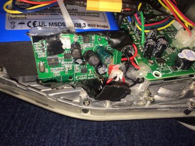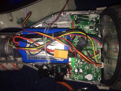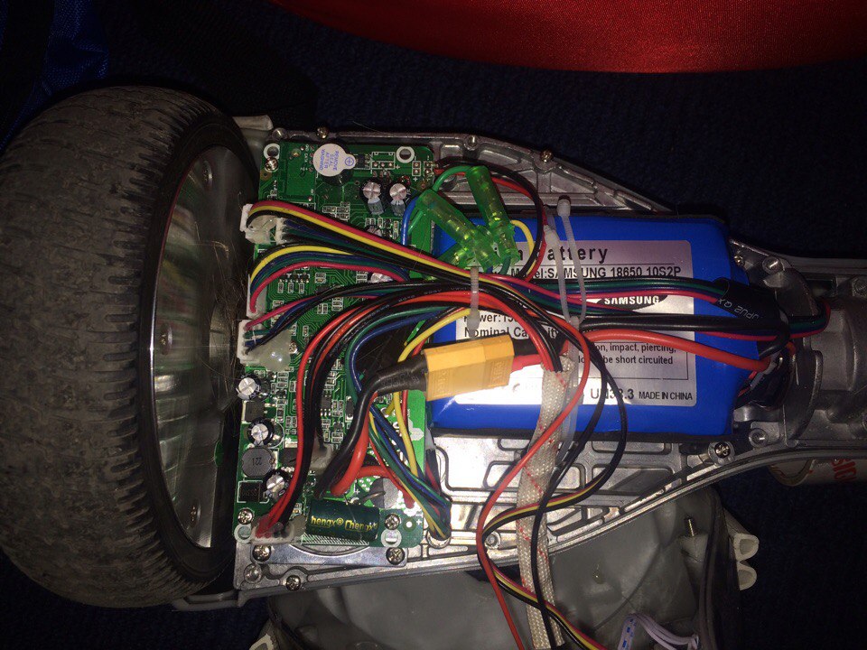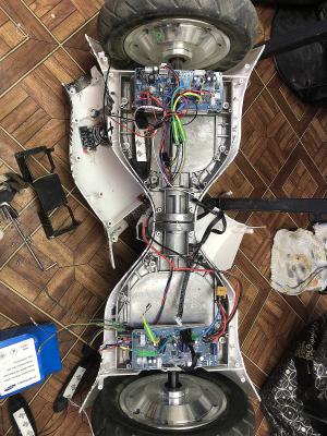 Подскажите пожалуйста по двухплатному гироскутеру Genesis. При первой зарядке гироскутер включился и прокричал про bluetooth соединение. В дальнейшем после выключения и включения, оповещение из динамика о включении bluetooth не было, блютус также не заработал. Более того - при выключениях/включениях гироскутер вообще более не издает ни единого звука. Даже не работают пищалки (впаянные в платы), которые должны сигнализировать об разряде аккумулятора либо о превышении наклонов корпуса. Заряда аккумулятора хватает на полчаса. Заряжается гироскутер также за полчаса. После вскрытия оказалось, что Bluetooth модуль оказался нерабочий. Один из проводов, которым соединены батареи (батарея 4400 разделена на две) был перебит и закрученным саморезом, который держит кожух, закорочен на металлическую раму.