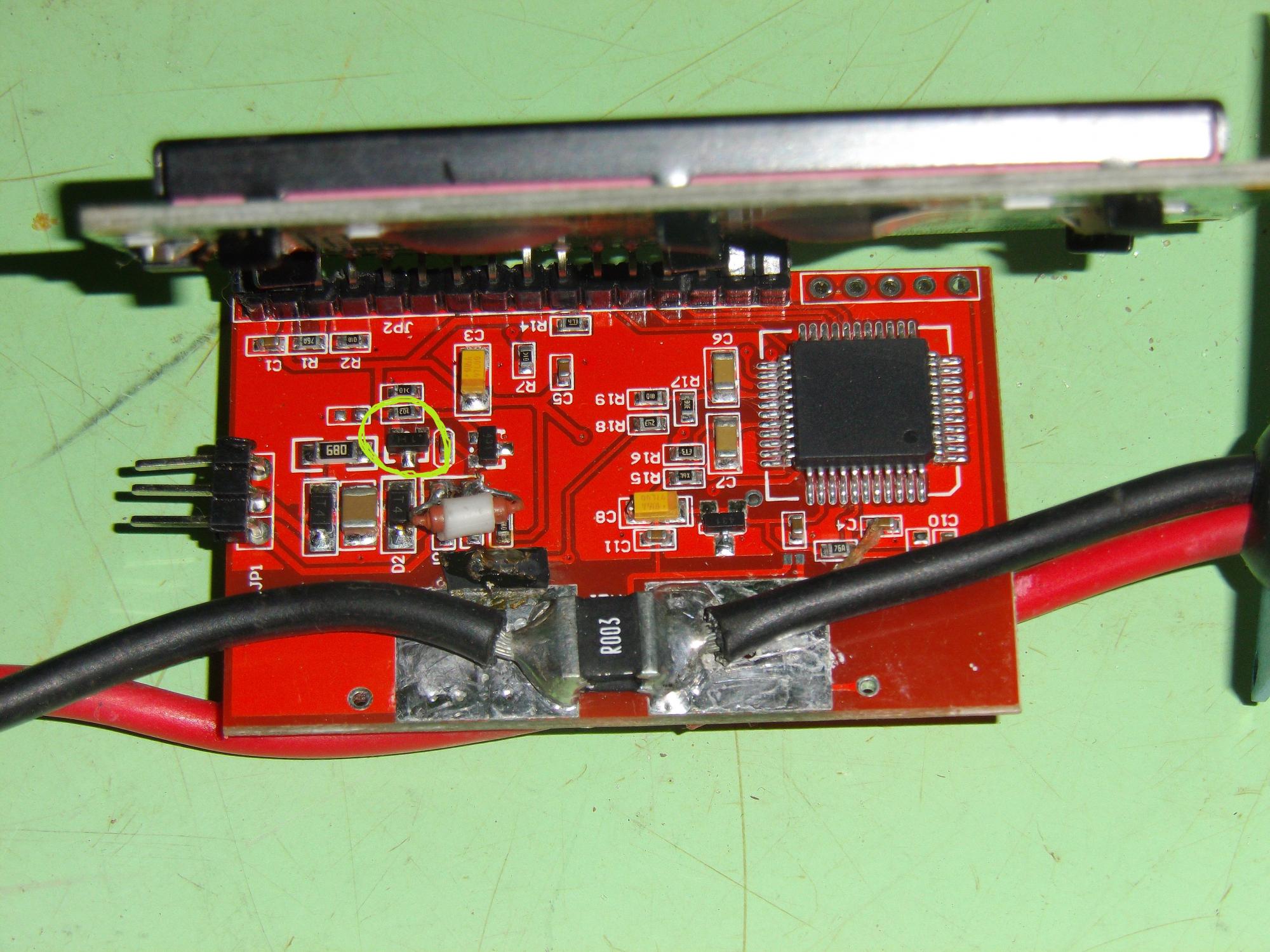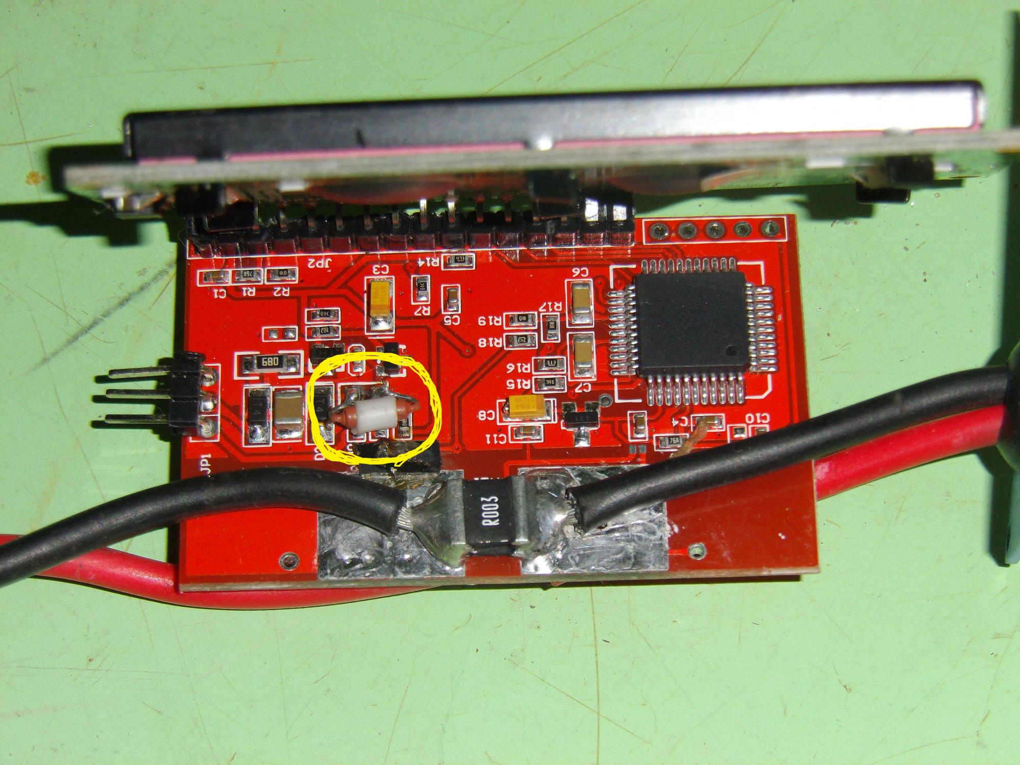 Здравствуйте.Проблема такая :ваттметр периодически тух ,а потом совсем потух. При вскрытии обнаружилось отсутствие одного элемента -предположительно резистораю Стал впаивать на это место разные резисторы 100к ,10к, 1к. Изображение появилось ,но резистор греется. Возможно родной резистор изначально тоже грелся, а потом расплавил олово и выпал . Может быть ваттметр сдох от обратного тока , т. к. у меня не было диода между ваттметром и контроллером ,и на ваттметр приходило напряжение от прямоприводного мотора через контроллер, а может изначально в ваттметре было что нибудь неправильно впаяно. По этому хотелось бы увидеть схему.Только мне нужна схема от ваттметра который может работать без внешнего питания ,потому что есть точно такой же на внешний вид ваттметр, только он не может работать без внешнего питания,