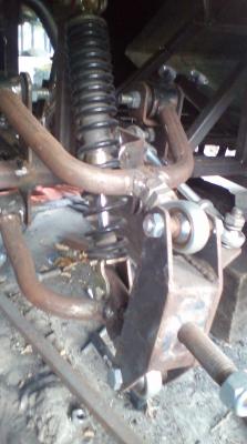 Тут не макфессон просится , а однорычажка , поворотный кулак жёстко соеденить с нижним рычагом и сделать шкворень для передней оси , верхний рычаг не нужен. Геометрия будет немного не правильная по автомобильным меркам , но так делают на мелких квадриках и обратных трайках , даже на багги такое есть.