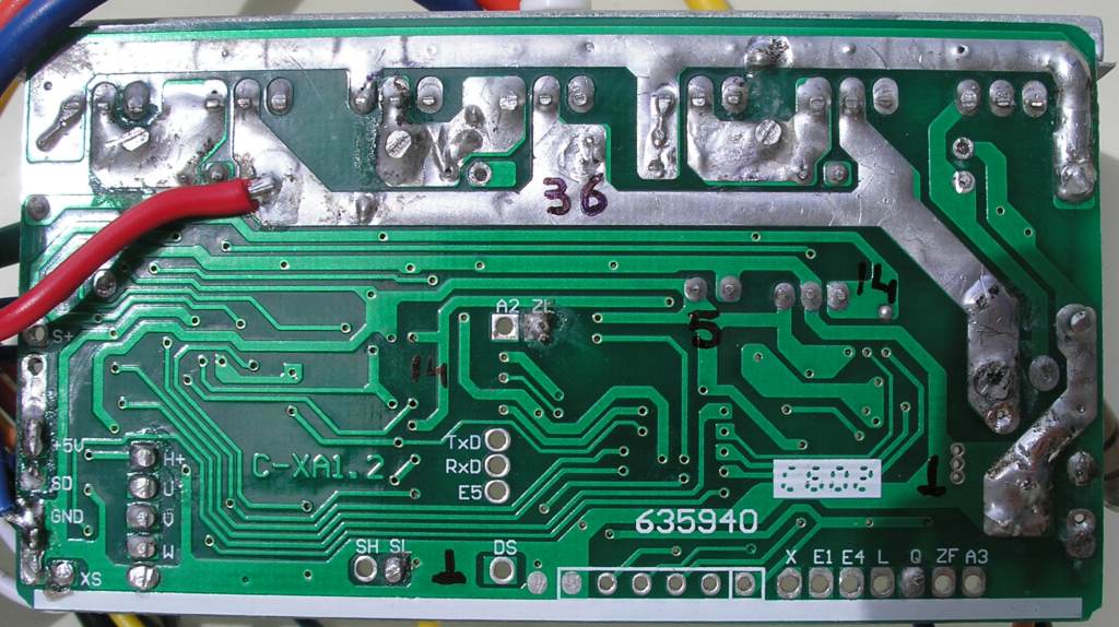 Наконец-то дошли руки до этого дела. Контроллер вскрыл. Выглядит плата у меня 1 в 1 как на фото у vpk8, совпадение 100% (см. выше). Припаял проводки к TxD и RxD и к земле, собрал обратно, соответственно LED-метр подключать не стал. И в итоге, нифига у меня не работает :(. Контроллер включается и крутит колесо со скоростью примерно 22-23км/ч на холостых. На соединение TxD и RxD с землей никак не реагирует :(. Собственно эта скорость соответствует той, что была в режиме "Low" с подключенным LED-метром. Поэтму вопрос остается открытым, как организовать переключение скоростей на контроллере с разъемом под LED-метр, но без LED-метра, может кто еще что подскажет?