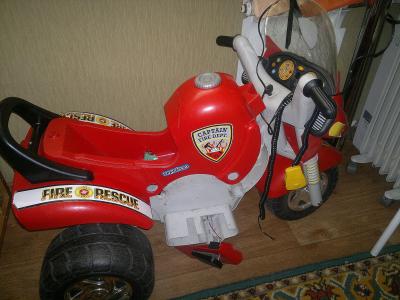 Дали нам попользоваться мотоцикл фирмы peg-perego. Привод на одно колесо, аккумулятор 6V, имеется только педаль, движение только вперёд.