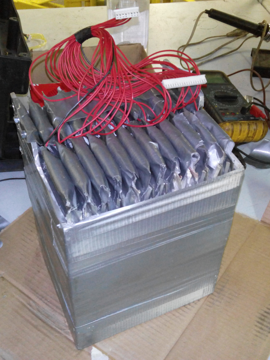 Далее АКБ была собрана из 24 пакетиков и сдавлена 2я алюминиевыми пластинами по 6мм толщиной, достаточно жестко.