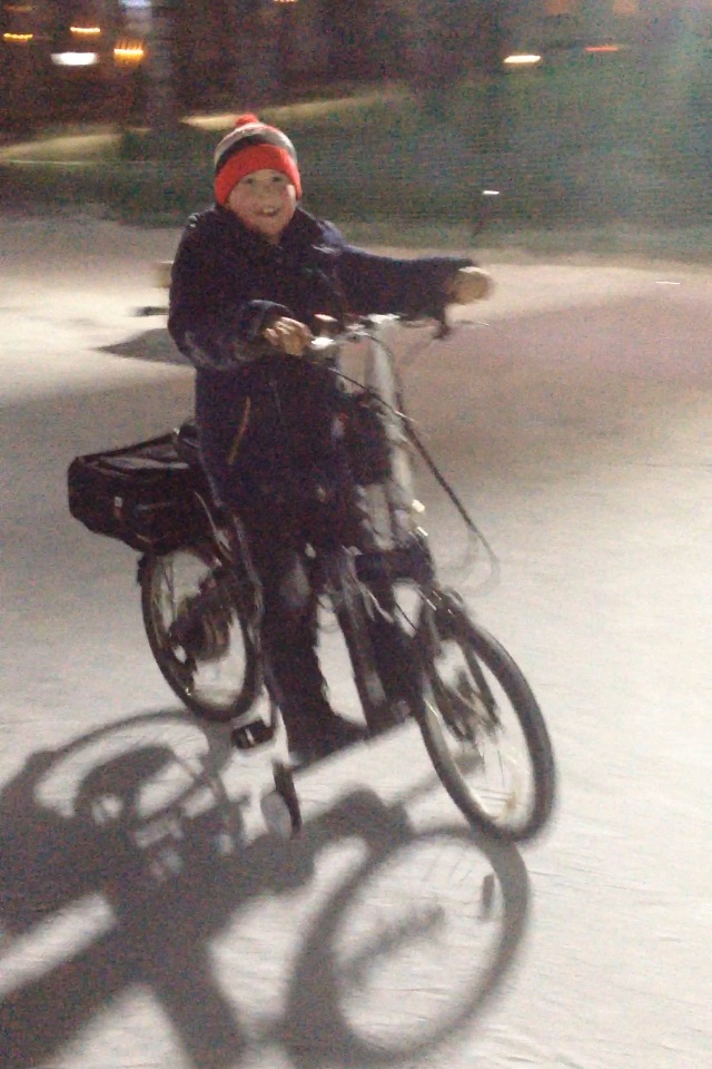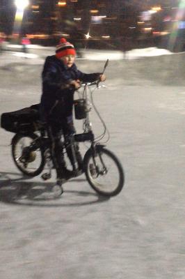 Проездил больше часа пока руки не замерзли - везде где мог и по парковым дорожкам и по колеям и по горкам  и даже заехал на каток у ёлки, покрутился там, дал даже пацанам покататься - те в восторге правда больше от самой езды с моторчиком :)  Езда очень уверенная практически везде где на обычном евеле вообще не рискнул бы ехать, а не то что еще давить на газ.  Не понравились развороты в узких местах - потом сделал проще просто ставлю ногу на землю наклоняю евел и даю газ и он разворачивается на 180 градусов. Проехал с полкилометра по чистому асфальту - для отклонения надо нажать не 3-5кг как я думал, а килограмм 10-15 - ролики шумят по зернистому асфальту как бешеные и осыпался пластиковый протектор в нескольких местах  - надо переходить на резиновые колесики.  Ну а в целом едешь без проблем абсолютно везде без опаски :)
