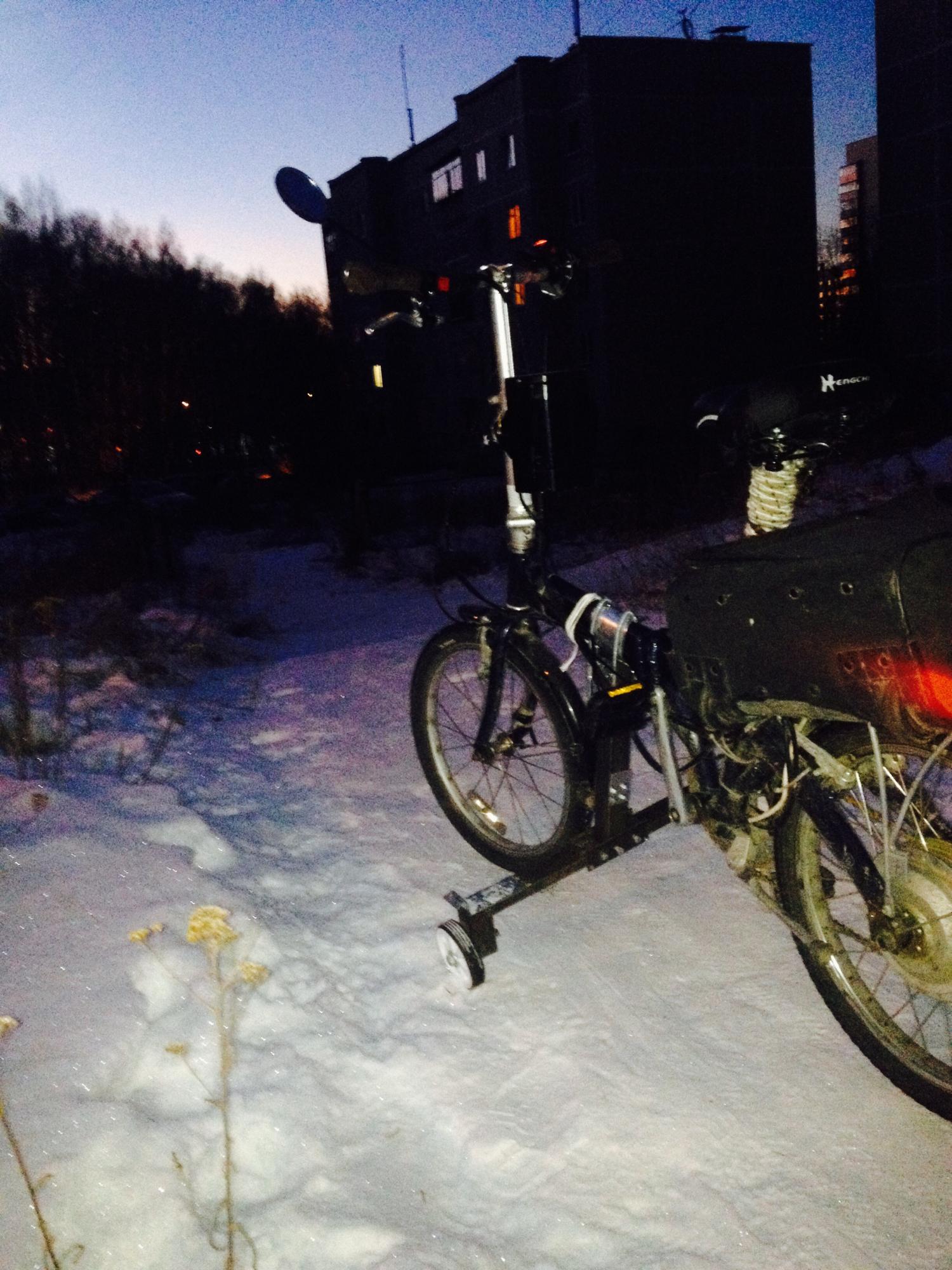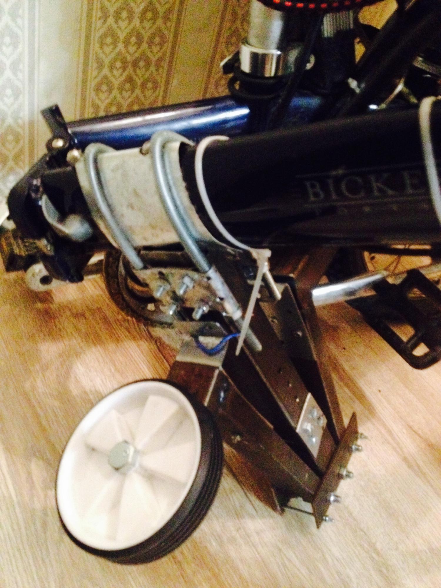 Только что закончил усиление конструкции ( не дожидаясь покупки гаража :) ), сделал мочнейшее крепление стойки к раме - даже нет намёка на люфты, выпрямил стойку и усилил подножки на траверсе, а также задрал оба ролика до 3-х см над дорогой :
