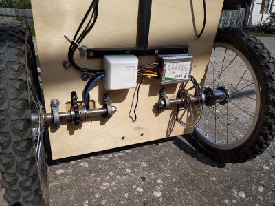 Скорость приличная ! А какое передаточное число Вы использовали звездочки на двигателе и на колесе? Да 15мм фанера - хорошее решение, наверно сам переделаю в следующем сезоне приблизительно так же,          а как крепится к фанере передняя часть рамы (руль+колесо) фотки нет?