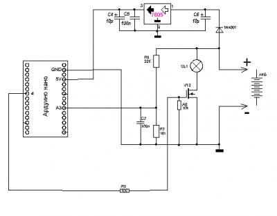 Ключ заряда (порт D13), ключ разряда (порт D4), делитель напряжения (порт А3), внешний светодиод (порт D10).