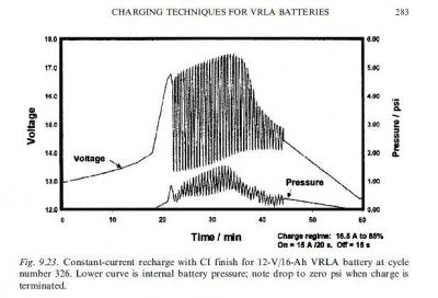 ЦитироватьA typical CI charge curve is given in Fig. 9.23, together with pressure measurements. In spite of achieving voltages in excess of 17V during pulsing (no voltage limit is imposed), hydrogen evolution is minimal, as can be seen by the pressure decay to zero after charge is terminated, with any remaining oxygen being scavenged by the negative plate.