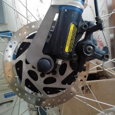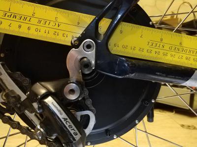 Второй момент - раму лучше выбирать без крепления дискового тормоза и совмещать крепление с усилителем (как в последствии для меня и сделали) - ось мотор колеса 14 мм, велосипедная ось 10 мм. Центр оси получается смещённым примерно на 2 мм, и если использовать крепления на раме то колодки будут не полностью захватывать диск. При изготовлении креплений тормоза совмещённых с усилителем есть возможность выставить центр от оси мотор-колеса.