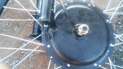 Сзади стоит "миникрошка" (шутка). Передние МАКи есть, может быть менее популярны. Сначала хотел ставить мотор сзади, но проанализировав, решил все-таки передний и именно МАС самой тяговой версии 16Т. Причин несколько: сложность проектирования усилителей дропаутов для заднего МК, подбор версии этого МК под 10-ти  скоростную кассету, не самое оптимальное распределение масс, ослабленная полая ось МК (в переднем МК ось цельная, вход фазных проводов расположен ниже оси). Не хотел превращать велосипед в неподъемного монстра, а использовать его в первую очередь с приводом от педалей (обвес по кругу SRAM X7). Задачей МК была помощь при подъеме в гору (а Крыму их много) и отсутствие сопротивления при педалировании с выключенным мотором . Скорость МК без потери крутящего момента увеличил установкой батареи на 74 В, 14.2 Ah, 1022 Wh (2s20p Li-ion 3.7V Lishan 32700-70M, полностью заряженная 84 В, отключение платой BMS при 55 В). Максимальная скорость на колесах 27.5 " около 38 км/ч, при этом заезжает в любую горку баз помощи педалей при небольших токах (12-15 А). Infineon 9fet IRFB4110 и Cycle Analyst ver 2.4 DPS прилагаются. Вот такой получился конструктор.