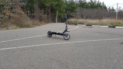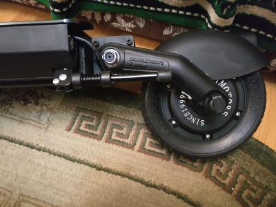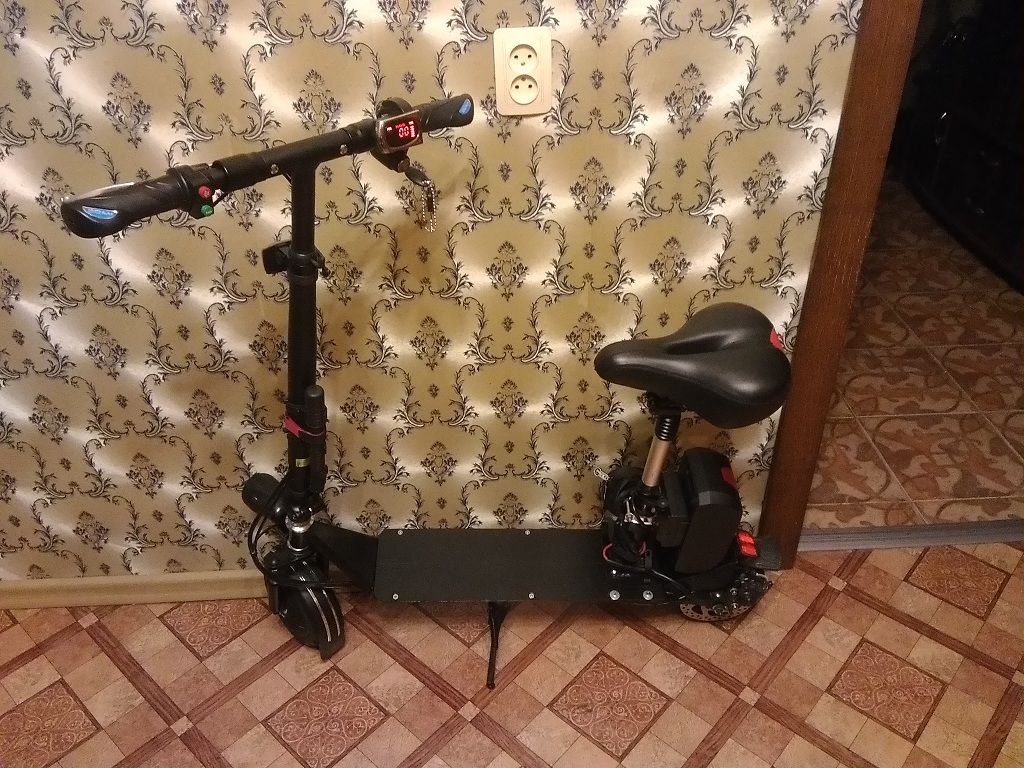 Вес с доп. батареей (10А/ч) 14,5 кг, её еще не испытывал, пробег на штатной батарее (емкость которой не указана, но заказывал 13,3 А/Ч) -24 мили, если верить показаниям, максимальная скорость скорость по спутнику 26,8 км/ч при моем весе 95кг  Вилка простая, пружинная, сделана хлипко, все время гнулась, пришлось обваривать.