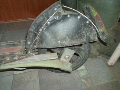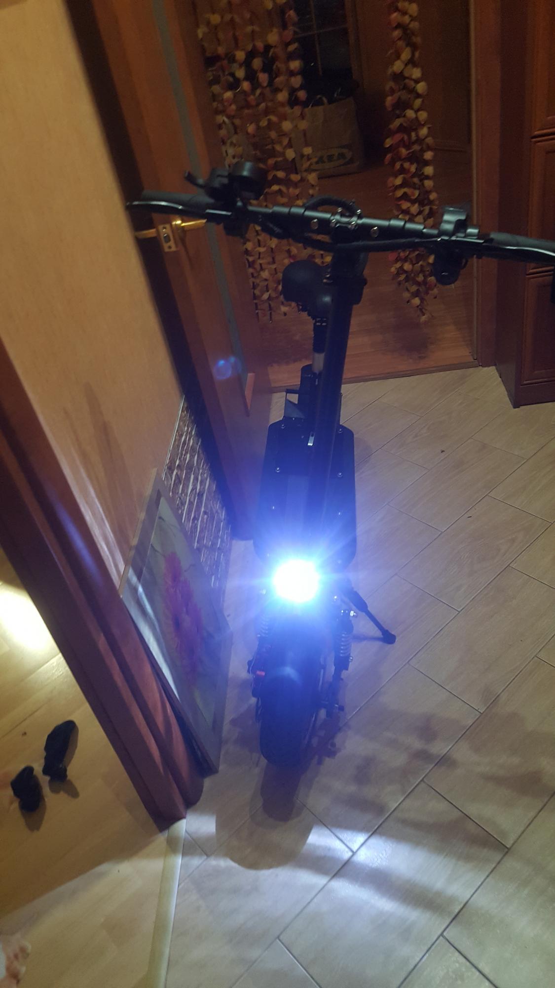 Доработка началась с замены аккума 36в/8а на 5х36в/4,5а. Для этого пришлось поднять на 16мм крышку деки путем установки пластиковых проставок (знакомый выпилил на чпу-фрезе  по моему эскизу). На фото их видно - они белые. Еще не покрасил.  Еще установил дополнительный диод в фару, прилично увеличилась плотность света. Запас хода по ровной поверхности - 40-45 км. Максималка 32. В горку тяги не хватает.