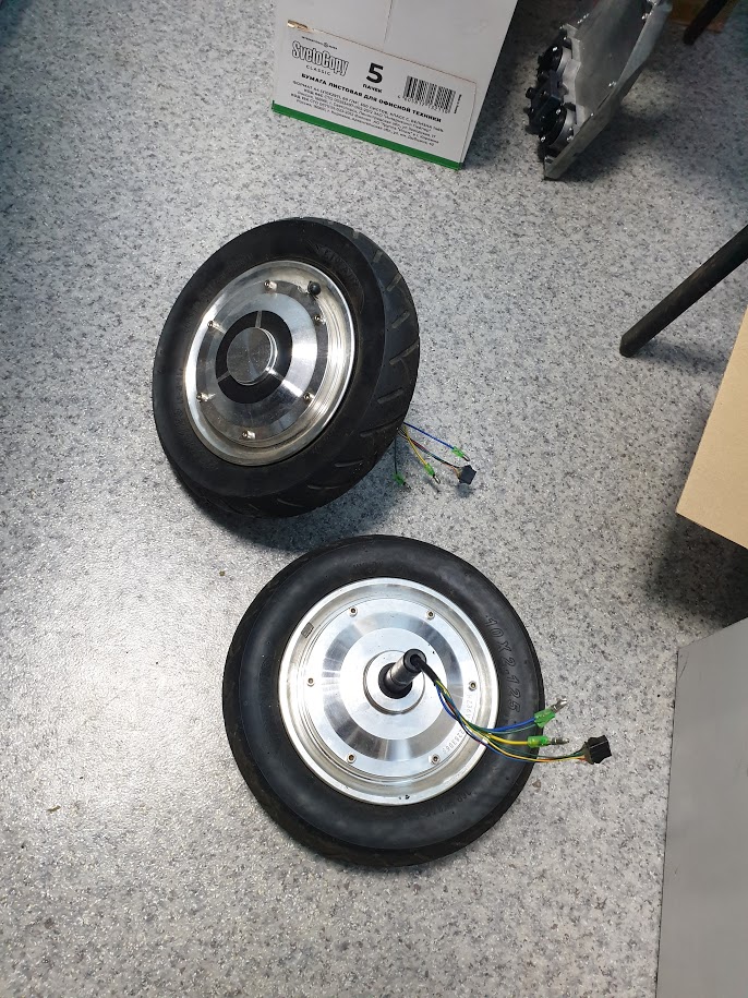 Имеется: самосборный самокат на 2-х гироскутерных колесах 10", 48 вольт, по 15А на каждое.