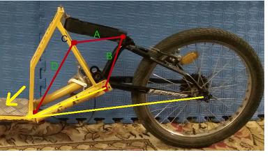 Вместо верхней перемычки, будет аморт (отрезок А) и будет он упираться чуть ниже, а именно на такое же расстояние от оси, которое сейчас между осью и кронштейном амортизатора. Соответственно второй кронштейн будет на этом же расстоянии (отметил отрезком В) Кронштейн будет в точке С. И для этого будет перемычка для жесткости (отметил отрезком D). Узлом соединения рамы и маятника, будет выступать кареточный узел маятника.