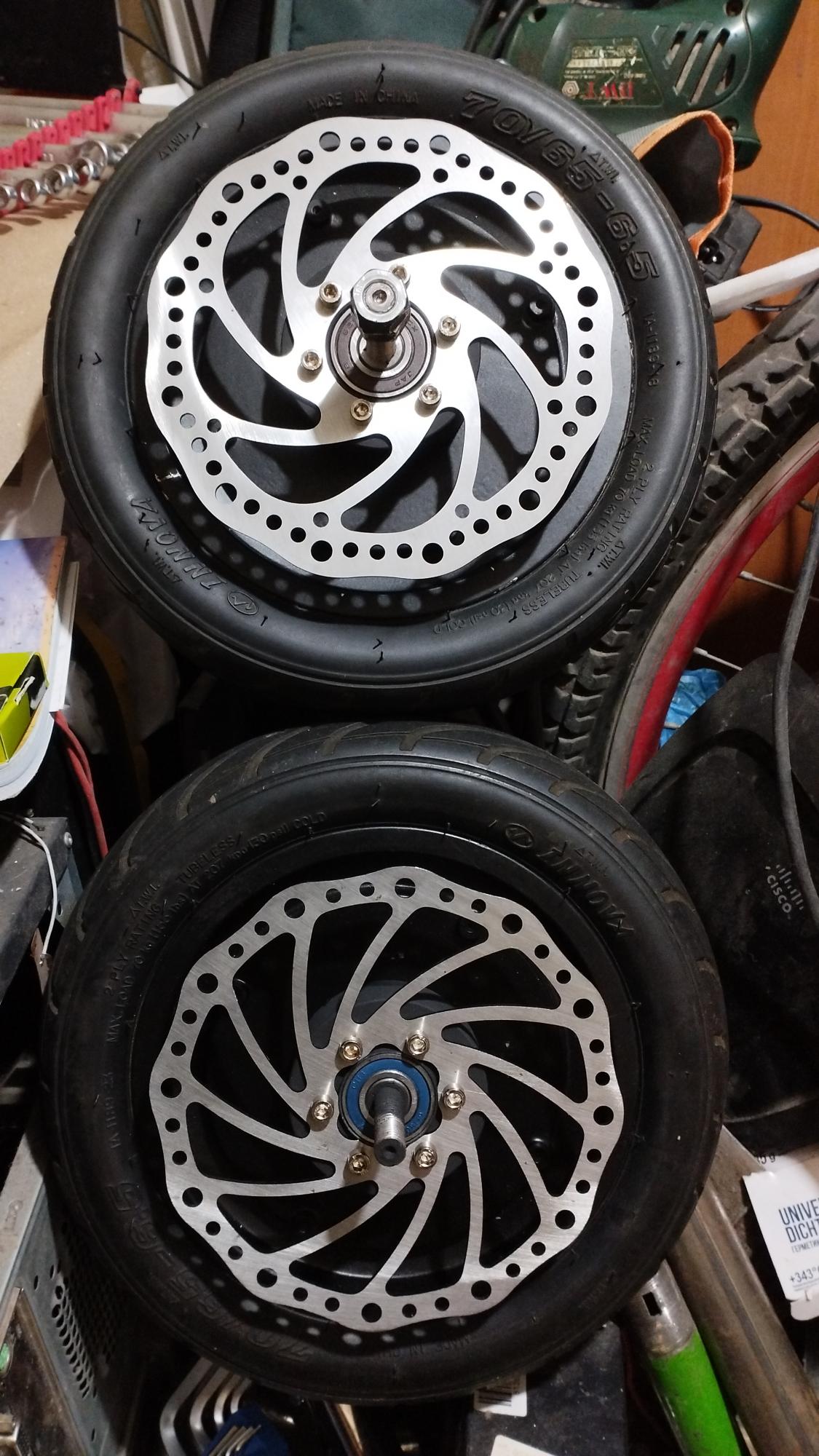 Приветствую! Потихоньку делаю самокат, уже готовы оба колеса. Колёса от гироборда по 350Вт, добавил на другую сторону ось и выточил крепления под дисковый тормоз. Под диск добавил опорный подшипник и под него сальник что бы уберечь мотор от попадания влаги по валу. Под креплением диска в месте прилегания к крышке мотора намазал герметик. Изнутри мотора крепление диска притянуты винтами и посажены на фиксатор резьбы (красный). Крепление под диск находится со сторы выточенной оси (второе фото снизу) и ложиться на 4 выступа с резьбой для дополнительной надёжности фиксации. Размеры диска великоваты но других меньше не нашёл так что тормоза будут очень чувствительные... В любом случае пока продолжу и пока соберу весь то надеюсь уже найду 110 или 120 мм диски. Сейчас стоят на 140мм. Крепление суппорта пока не буду приваривать основательно. Есть ли что то критически важное я не учёл для безопасности?