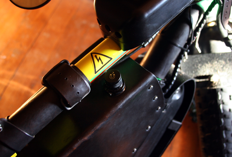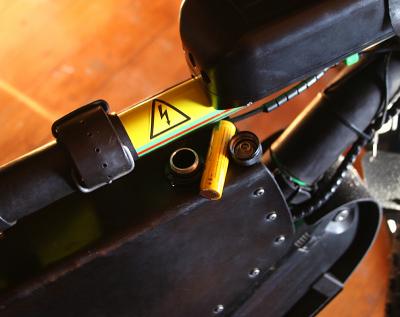 У меня был велофонарик не то польского, не то чешского производства, сделанный для Германии, где стробы под запретом. Поэтому в нем всего 2 режима, вкл. и выкл., то, что надо. Сам фонарик был довольно хлипенький, но наличие в нем платки без каких-либо управляек, только с 3 диодами и 3 резисторами, позволило заюзать его в качестве донора. За основу, как уже делал на прежнем э-веле, взял в ближайшем "Би-Би" красную габаритку, и интегрировал в нее вместо 2 контактов под лампочку пресловутую плату с "колпачками". Исходный фонарик кушал от двух ААА. Это меня не устраивает, для подобных целей у меня куча 18650 разной емкости, и хороших, и китайского но-нейма, оставшегося от сдохших в разное время налобников. А 3В подается на плату или 3,7, диодам все равно. Поэтому в качестве бокса для банки взял корпус круглого ручного фонарика, "отрезал лишнее" и врезал его в верхнюю часть кожаного бокса рамной АКБ - места у меня там много.  Там же, на переднем торце, расположил клавишную кнопку, щелкнуть которой сидя в седле не проблема, просто не глядя опустив левую руку вниз.
