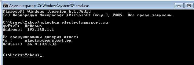 но фишка в том что nslookup  показал Ваш ДНС сервер сначала.. 192.168.1.1 а потом показ АйПи который вернул этот ДНС сервер)  и этот АйПи правильный..