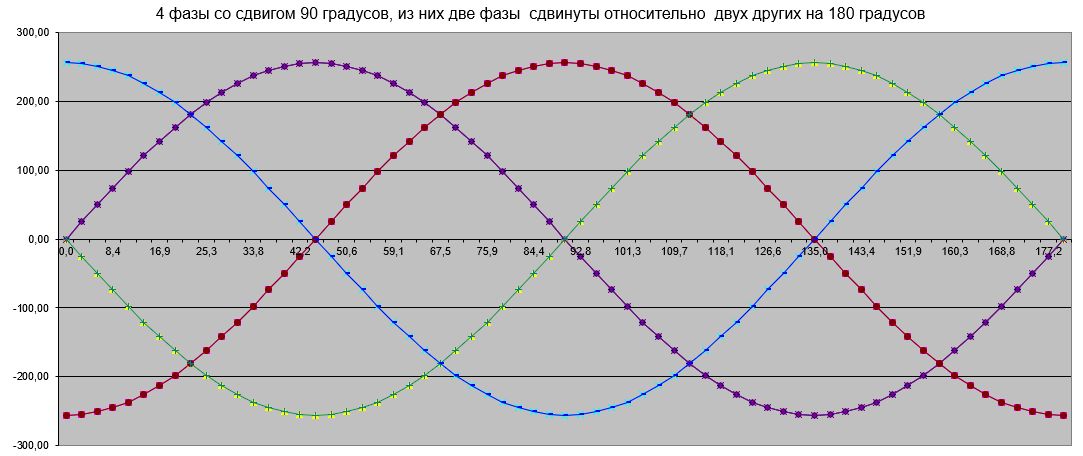 А с вашим определением моей конструкции, как четырехфазной, я не согласен по описанной выше причине - в четырехфазной схеме сдвиг фаз равен 90 градусам.