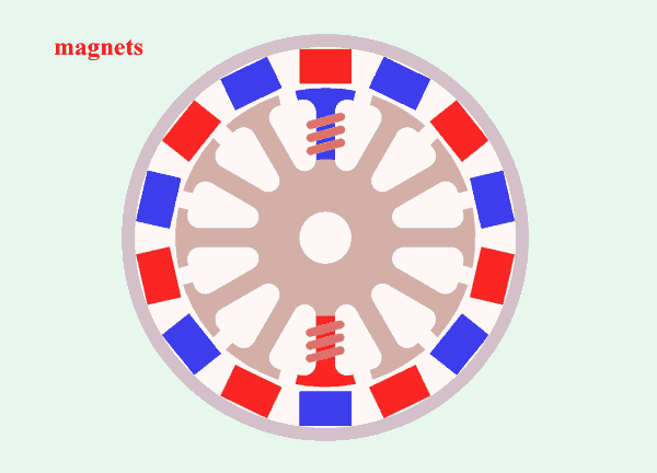 Это в классической симметричной магнитной схеме мотора, у которой внутренний ротор имеет четное (2, 4, 6, 8...) количество противоположных полюсов, разделенных осью вращения. И все полюса явновыраженные. Но число полюсов здесь в два раза больше числа магнитов.