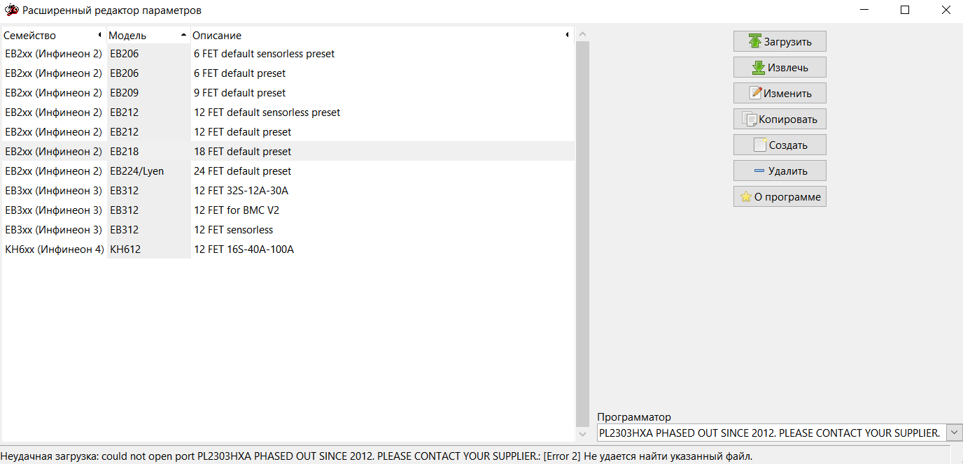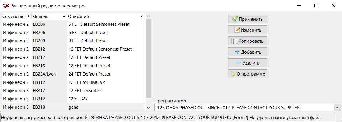 Понадобилось спустя несколько лет покатушек изменить напряжение отсечки батареи. XPD 0.4.0 при чтении параметров контроллера определил его как EB312, хотя у меня EB306/CELLMAN. Обратно заливал конфиг уже изменив модель контроллера на корректную. Прошилось нормально, все настройки совпали с теми, что указывал в проге. Но перепутать количество мосфетов это конечно странно.