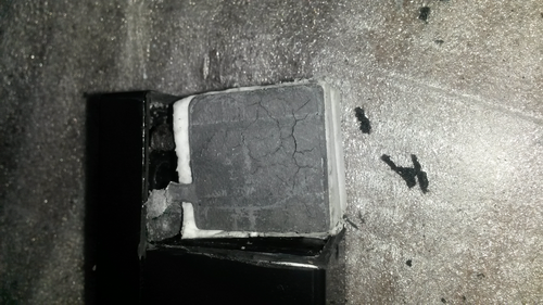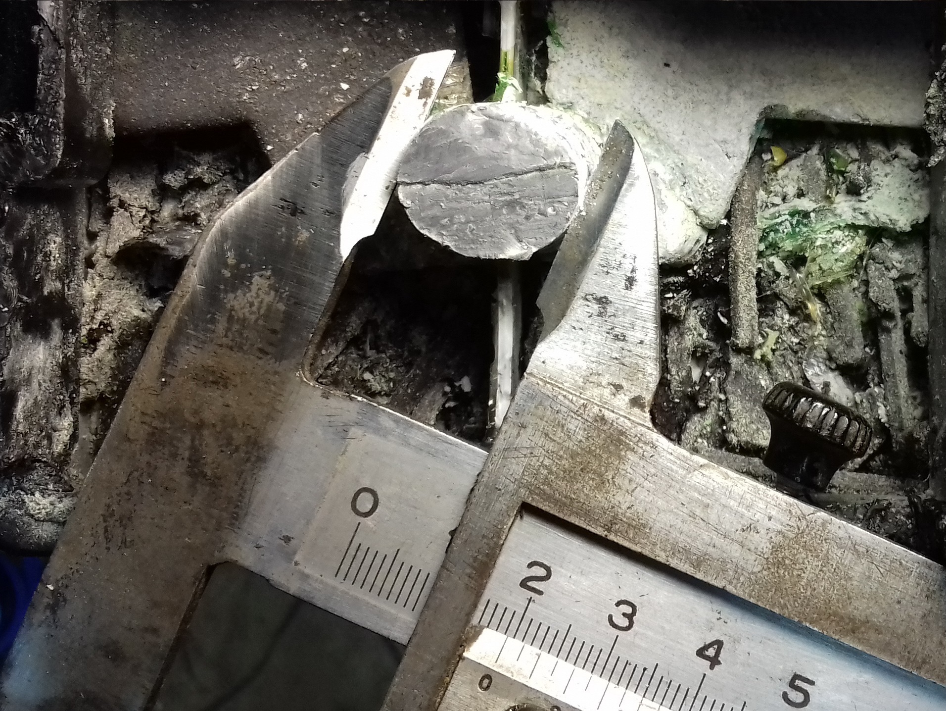 Пильнул эпоксид на уровне верхней точки перемычки, чуть ниже (на фото) положил срезанный кусок. На нем видны позеленевшие от контакта со свинцом места, т.е. - попал тютелька в тютельку, срезав ~ 1мм перемычки.
