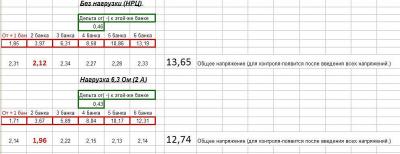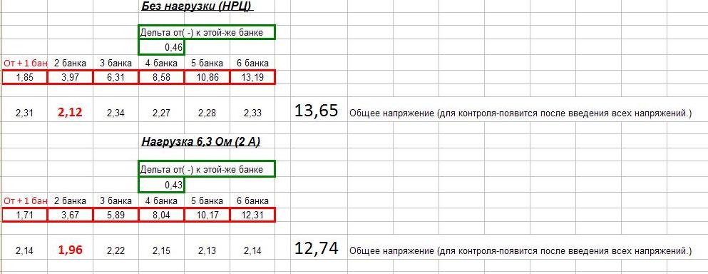 Провёл замер напряжения  по банкам методом третьего электрода в режиме НРЦ и под нагрузкой 6,3 Ом.