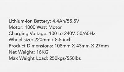 ТТХ:  скорость 32кмч (20mph), 32км (20 миль) пробег, 1000 Watt Motor, возит до 250кг..   1 час зарядка!!