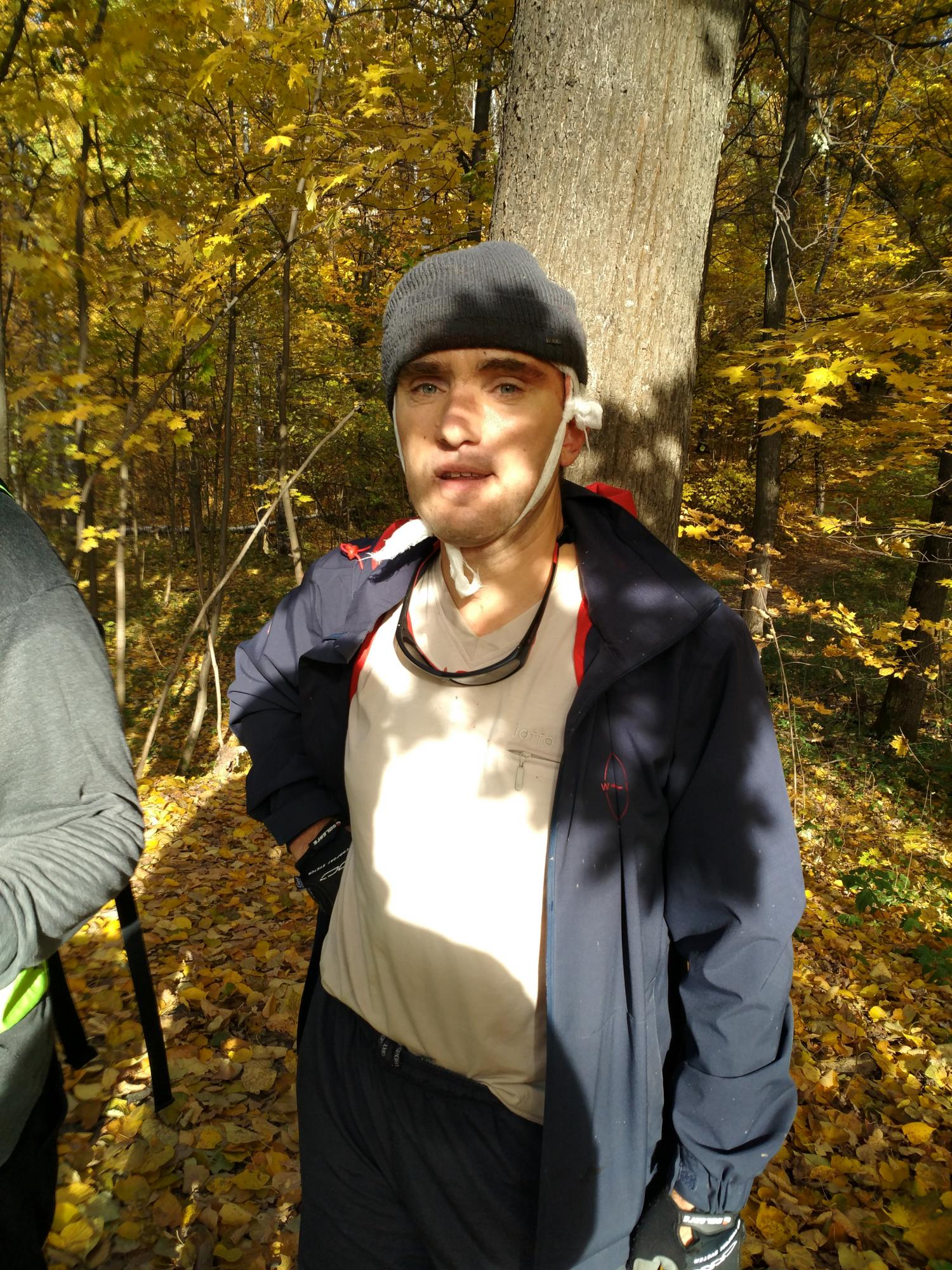 Оказалось, Володя ухнул в нырок, на дне нырка бугорок, на котором он подлетает, влетает в начинающийся подъем, байк уже не контролирует, а вот оно и дерево, мы ж в лесу. Причем без шлема, в вязаной бронешапке. На темени россечение 5 см. Промываю мирамистином и крепко прижимаю салфеткой рану рукой, держу так 5 мин. Спрашиваю, шея хрустела, говорит нет, но болит грудь и в спине. Вспоминаю Микаэля Шумахера на лыжах, очко играет. Кровотечение прекращается, засыпаем рану Банеоцином, другой боец грамотно бинтует Володе голову и Серега на Легераде сопровождает Туляка в ближайший трамвпункт. Далее вроде обошлось (пока), пусть Серега расскажет сам.