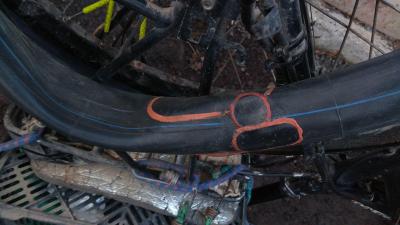 Обод сильно пострадал только с одной стороны, с другой почти не смят, видимо удар на один бок колеса больше пришёлся, потихоньку подсунул широкие кусачки и ми очень медленно по чуть чуть действительно отжал, потом пассатижами попробовал выровнять но тут уже хрен там, чуть чуть поправилось но хрусть и появилась ещё одна продольная трещина сбоку в этом месте, люминь явно калёный. Лать, выковыриваю покрышку и там "приятные сюрпризы продолжаются.. Не "змеиный укус" а конкретный КУСЬ, две прорези сантиметра 3, ну и обычный змеиный пара мелких дырочек там же для полноты картины.