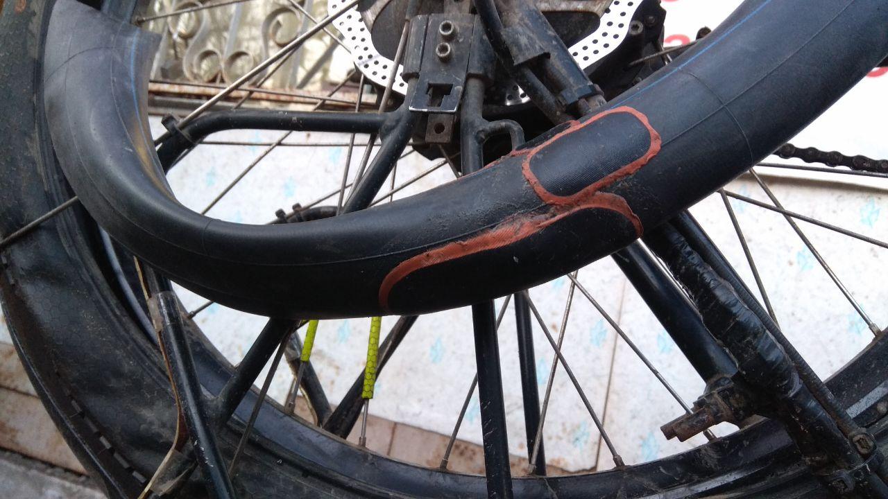 Ну пробую поставить и накачать, будь что будет. покрышка ставится, хм.., подложил на битое место кусок резины чтоб углами трещин не прорезало покрышку, бортую и качаю.. Держит ! Тааак.. Ставлю на колёса и пробую сесть поехать, восьмёрка но это и так видел она небольшая, хм едет байк.., чуток проехался туда-сюда по дороге и вроде держит всё и хрустеть разваливаться колесо не собирается да я понимал что зонт спиц удерживает всё в вместе в любом случае даже если полностью бы продольно лопнуло. Но вот камера явно спускать начала, блин..