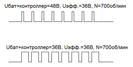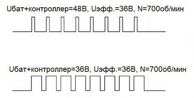 В данном случае, в следствие применения ШИМ для регулирования, в равных условиях (эффективное напряжение на выходе, ток через МК (а значит мощность)) комплект 36В/36В будет иметь больший КПД (МК будет иметь больший момент), чем комплект 48В/48В.