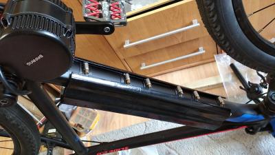Весьма повезло. Туринговая рама Ино так устроена, что на ней полно специальных резьбовых отверстий с приливами для крепления всего чего ни попадя. "И как назло", расстояния между парой таких отверстий на нижней стороне трубы рамы идеально подходят для крепления передней части базы-площадки съемного корпуса АКБ. С нижней частью базы было сложнее. В ней есть одно отверстие, и в теории можно было бы закрепить площадку с помощью хомута для труб 50 мм. Т. е. на трубу рамы 1 половинку хомута, к площадке привинтить вторую, болтом с предельно плоской головкой, расположенной внутри хомута, и при монтаже штатно стянуть половинки хомута болтиками с гайками. Но крепеж в этом месте надо было бы делать сквозным, с выходом на наружную сторону базы того болта, который закреплялся бы в хомуте. И тогда его конец с гайкой помешали бы боксу сесть на место. Расположить же гайку внутри отверстия базы, впотай - можно, но крепление в пластике базы вышло бы хлипковато. Короче без графических пояснений понятно только тем, кто имел дело с этими боксами, остальным придется просто поверить  :-D