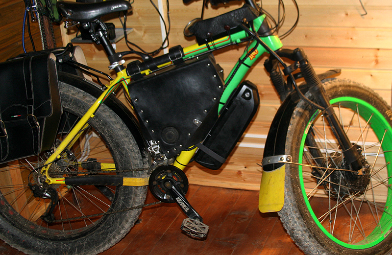 Такое расположение второй АКБ мне нравится куда больше чем с ящиком на багажнике. Правильнее развесовка, низко расположен центр тяжести, и вообще никак не увеличивается габарит. Зазор между крылом и корпусом достаточный, плюс ход вилки у меня небольшой, т. к. пружинка. Да и по бордюрам не скачу, т. к. не понимаю этой радости на довольно тяжелом электро, а также по причине их отсутствия за городом. Кроме того, батка очень мало весит.