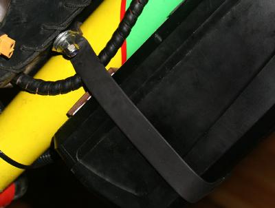 Проще всего было бы притянуть нижнюю часть корпуса АКБ к трубе большим перфорированным хомутом. Что мы изначально и сделали. Но не люблю я эти хомуты чисто эстетически. И не покрасишь их, даже битумная грунтовка с нержи стирается. И в термоусадку можно затянуть лишь частично, по понятным причинам. Поэтому нашел другое решение - хомут из электромонтажной ленты. Из нержавеющей, затянутой в термоусадку, которая выполняет несколько функций: защищает трубу и бокс от царапанья при монтаже, обеспечивает некоторую амортизацию стяжке и делает хомут менее заметным на черном фоне.  На трубе рамы ответная часть хомута, соответствующая ее диаметру. Из дюраля, хотя подошел бы и хомут для труб, но которые я тоже недолюбливаю - за корявость и склонность темнеть и рыжеть пятнами, несмотря на цинкование. Стяжка болтами М6 с нержавеющими гайками и контргайками. Получилось надежно и на мой взгляд прилично внешне.