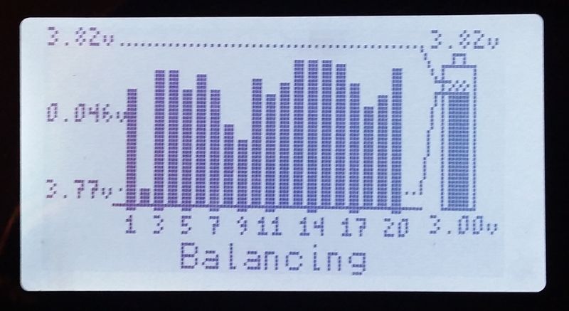 Перейди на экран БМС нажав два раза вправо от главного экрана, затем вниз, BMS Setup, Cell V config, Balansin'. Опусти его до напряжения самой разряженной ячейки, сохрани все, дай постоять пол дня, затем верни обратно и дозаряди батарейку. Разбег менее 0.010V не в счет.