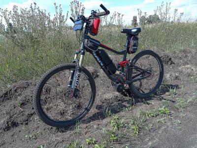 Велосипед джамис с 26" колесами,переднее мк 350 ватт MXUS,батарейка одна 10,6 амч. 48 вольт и вторая  16амч 48 вольт. Маскималка без педалей 34 кмч.   По грунтовкам с подьемом до 4 процентов идет с ускорением,до 7% просто держит набранную скорость  а дальше надо помогать педалями.