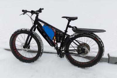 Фэтбайк mongoose с мотором eLight. Батарея 23s3p 21700 85в 14.4Ач. Вес 26кг. Контроллер Infinion-4 12f. Сейчас стоит сзади звезда 60Т на зиму, на супер тягу, при этом максималка 60+кмч. Летом планируется уменьшить заднюю звезду и разгоняться до 80кмч.