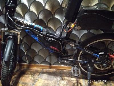 Складничок GoGoBike. Мотор от скейта 36/350, поставлен в режиме фрикциона. 30 км/ч, до 40 км. Вес 16.5 кг.