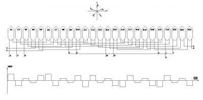 a-21, b-9, c-22, d-10, e-23 - РЕАЛЬНО РАБОТАЕТ! Саму схему с разрисовкой МДС статора в момент времени, когда по одной из фаз обмотки протекает максимальный ток, выложу позже (после соответствующего оформления).