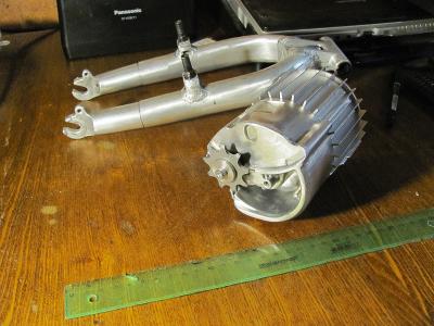 Разобрался наконец с токаркой и собрал движок. Хорошо помещается между колесом и кареткой. Для кучи выточили вставки для вилки и обрезал её до 16 дюймов. Затарился люминем, буду пилить кронштейн движка, потом  потащу на сварку.