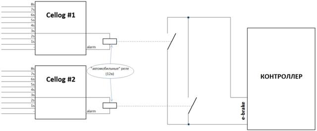 А мне удалось ... с помощью двух реле (питание на них подается с вх. 3s Cellogа, второй вывод реле подключен к выходу "alarm", который не имеет контакта с "-" Cellogа).