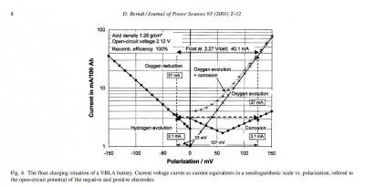 Внизу указаны две побочные реакции на положительном электроде, идущие при заряде. Обе - с участием воды. Одна - обобщенная реакция окисления свинца решеток. Вторая - реакция разложения воды с выделением кислорода. Каждая реакция имеет свою тафелевскую зависимость (скорости реакции) - тока от потенциала. Ток последней реакции существенно выше тока первой.