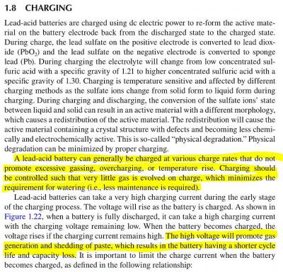"Свинцово-кислотную батарею как правило можно заряжать, до такой степени, чтобы не вызывать чрезмерного выделению газа, перезарядки или повышения температуры. Зарядка должна контролироваться таким образом, чтобы выделялось очень мало газа, что сводит к минимуму потребность в доливе (т.е. требуется меньше обслуживания)."